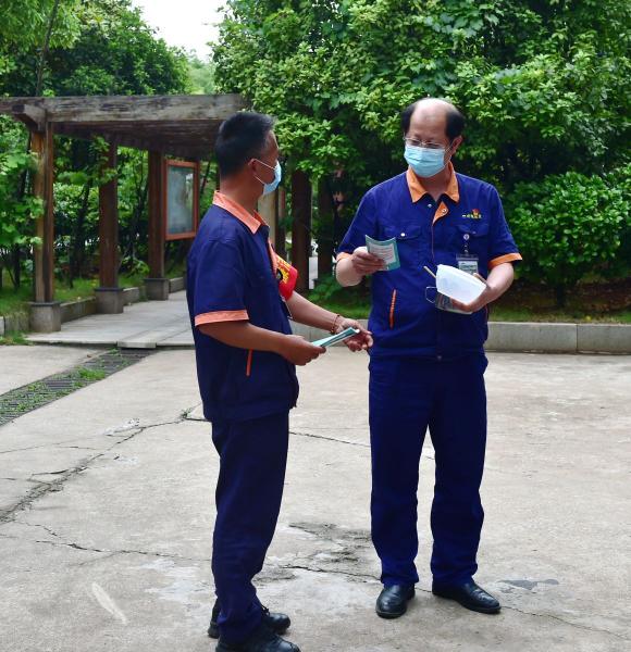 纪检委员向公司副总经理郑杰(右一)发放信访举报相关宣传手册。