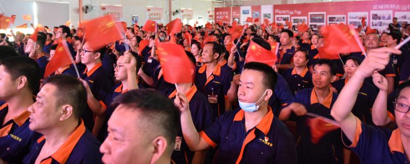 全场观众全体起立,挥舞着国旗,与公司领导班子一起共同合唱《歌唱祖国》,整个现场变成了一片红色的海洋