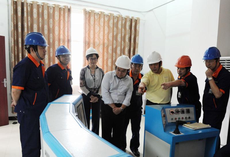 集团副总刘冰(右四)一行调研磨浮自动化室。