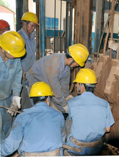 7月2日,骄阳似火,酷热难耐。提升车间拉开了二期箕斗首绳抢修序幕。尽管天气炎热,所有参战人员从容应对,有条不紊。指挥者、缠绳者、翻绳者、收绳者等各负其责,整个抢修现场热火朝天。抢修人员克服高温酷暑天气,发扬不怕苦、不怕累的精神,认真做好每一道工序,历时二天二夜顺利地完成了二期箕斗的抢修任务.