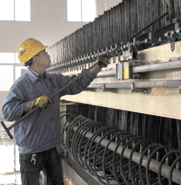 选矿车间脱水工段员工在硫压滤厂房忙碌生产
