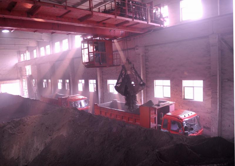 选矿车间脱水工段行车工在转运产品。
