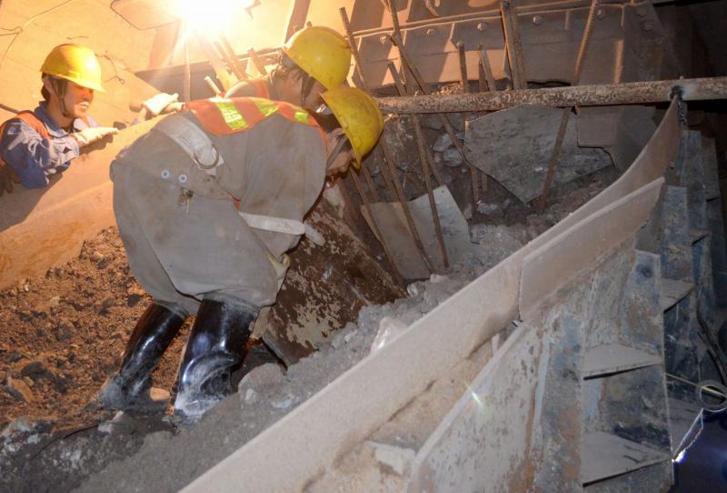 -520米中段转载漏斗是公司井下供矿的“生命线”,承担着公司3个中段的供矿任务。晚上,车间主任湛若中下井赶往事发点。在查看现场后,湛若中征求大家的意见,商议抢修方案。随后,供矿人员卢坤柏、周辉华,出渣人员张云川、石红峰,维修人员刘顺生、梅向清各就各位,投入到抢险战斗中。他们从维修硐室运来电焊机、氧焊器材、维修工具、钢板、安全保险带等抢修器材。有的抡起大铁锤敲打钢板上的锈铁皮;有的拴住安全带扒渣,清理作业场;有的插好转载漏斗上的钢筋保护,防止毛石落下伤人;有的抬起约200斤重的钢板,运往转载漏斗处……