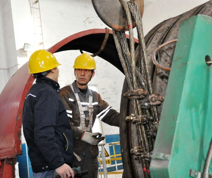 在周密的部署下,收绳工作拉开了序幕。抢修人员分三路进行:一路人马由黄国胜工段长带队奔赴井塔八楼用行车拉住磨擦轮中的绳子;另一路人马由副工段长谢俊明带几名钳工到七楼上夹板,固定平衡锤这头的首绳,稳定平衡锤;第三路人马由副主任左可福带领几名钳工在井塔一楼井筒搭二道平台,然后用钢丝绳将箕斗悬挂于井筒钢梁之中固定。