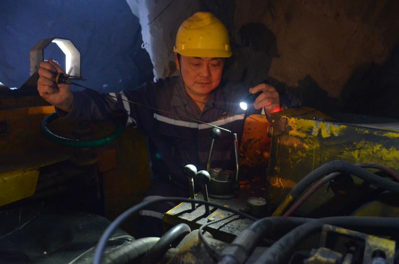 果敢与坚毅写满了黝黑的脸庞,炯炯有神的双目闪烁着自信与坚定,魁梧的身躯散发着精悍与干练,他就是采矿车间设备组组长、机械工程师江子华。