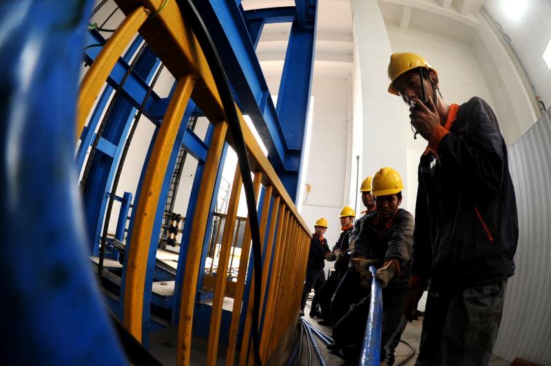 “五一”期间,新副井井口一派繁忙景象。提升车间副工段长谢俊民拿着对讲机,忙而有序地协调钳工师傅按照通信电缆。