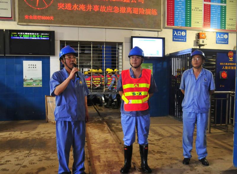 6月27日上午,井下-520米中段民采空区贯穿透水,大量的水夹杂泥沙杂物从14线穿脉突然涌出将穿脉口运输巷道冲坏堵塞,照明配电系统接地跳闸,-520米中段下盘12线-3线各作业点作业人员来不及撤离就近进入10线避灾硐室紧急避险,-520米中段其他作业人员迅速沿安全通道从副井撤离,-510米中段作业人员迅速沿避灾线路向上一水平中段撤离。“透水了、透水了”,井下员工按下定位卡“求救”按钮报警求救,用矿井移动手机向公司总调报告。公司指挥调试中心报警信号此起彼伏,公司突透水淹井事故应急撤离(避险)演练正式拉开。