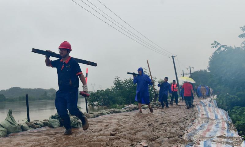 2020年7月,易智(左一)带领支部党员步行6公里参与大冶桃花垦区叶家咀段河堤抢险。