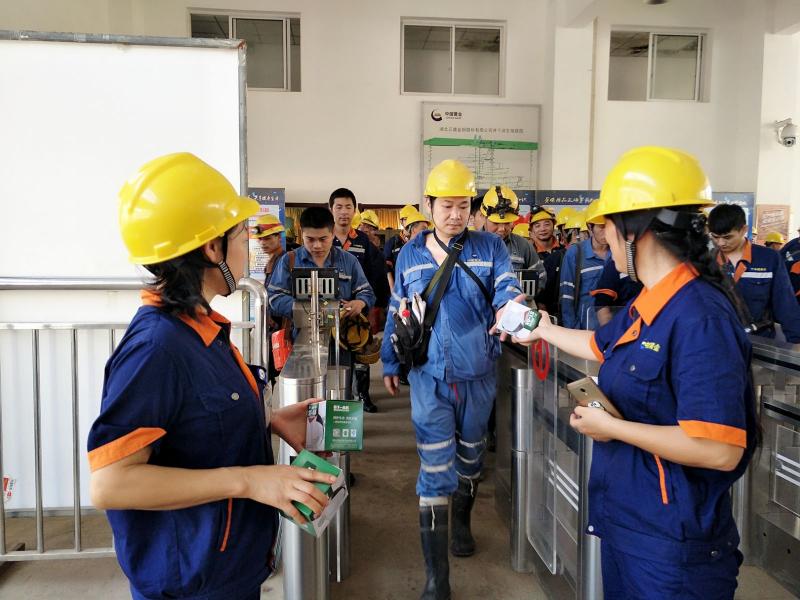 女工委在井口发放防尘口罩
