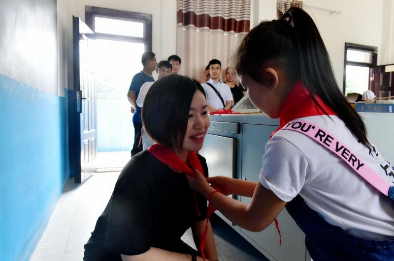 留校儿童为该公司团委书记彭凌系上红领巾表达感谢之情。