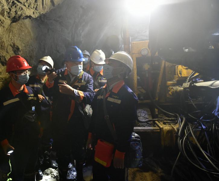 刘福广(右一)一行在-596米掘进台车现场检查工作。