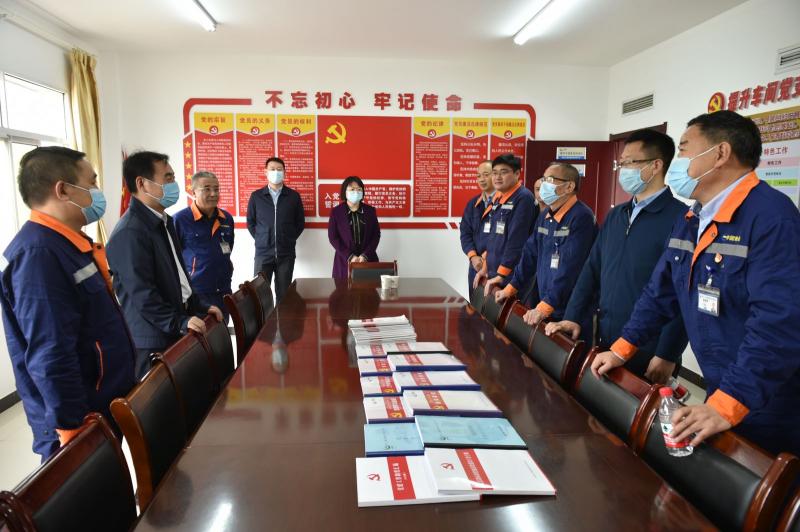刘福广(左二)一行在提升车间党员活动室调研指导工作。