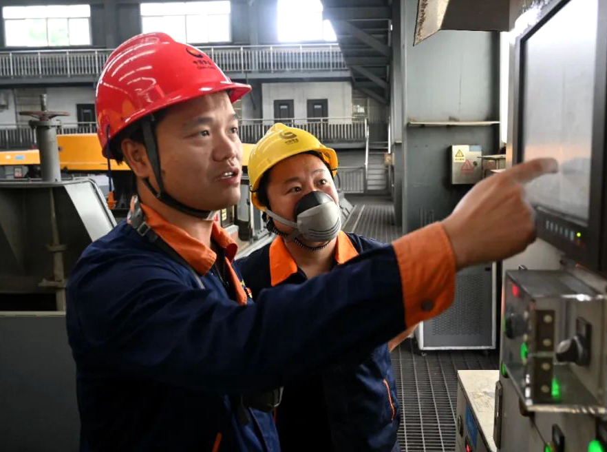 班前会后,张虎查看X荧光分析仪显示器数据