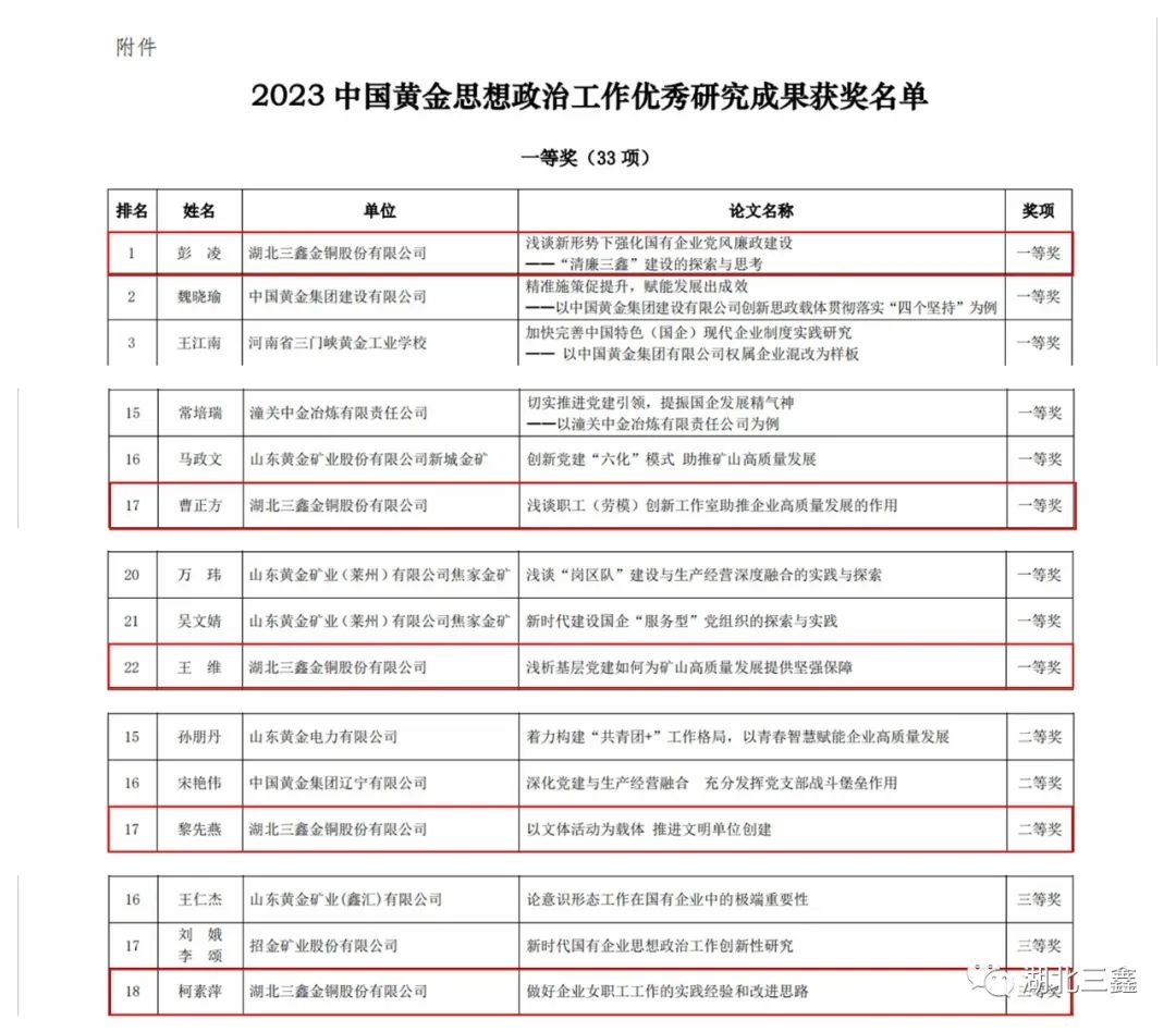近日,中国黄金思想政治工作研究会表彰了2023年度优秀研究成果评选结果的决定,公司报送的5篇论文全部获奖,其中《浅谈新形势下强化国有企业党风廉政建设 ——“清廉bv1946伟德”建设的探索与思考》《浅谈职工(劳模)创新工作室助推企业高质量发展的作用》《浅析基层党建如何为矿山高质量发展提供坚强保障》荣获2023年中国黄金思想政治工作优秀研究成果一等奖,《以文体活动为载体 推进文明单位创建》《做好企业女职工工作的实践经验和改进思路》分别荣获二等奖、三等奖,创下连续4年推送政研成果的最好成绩。