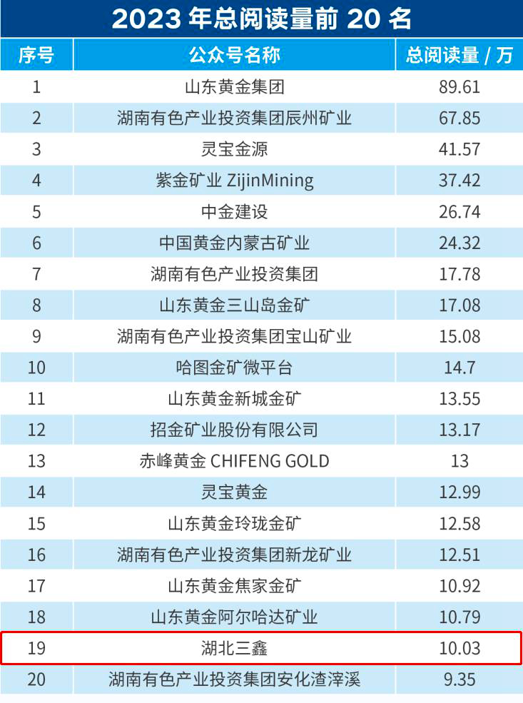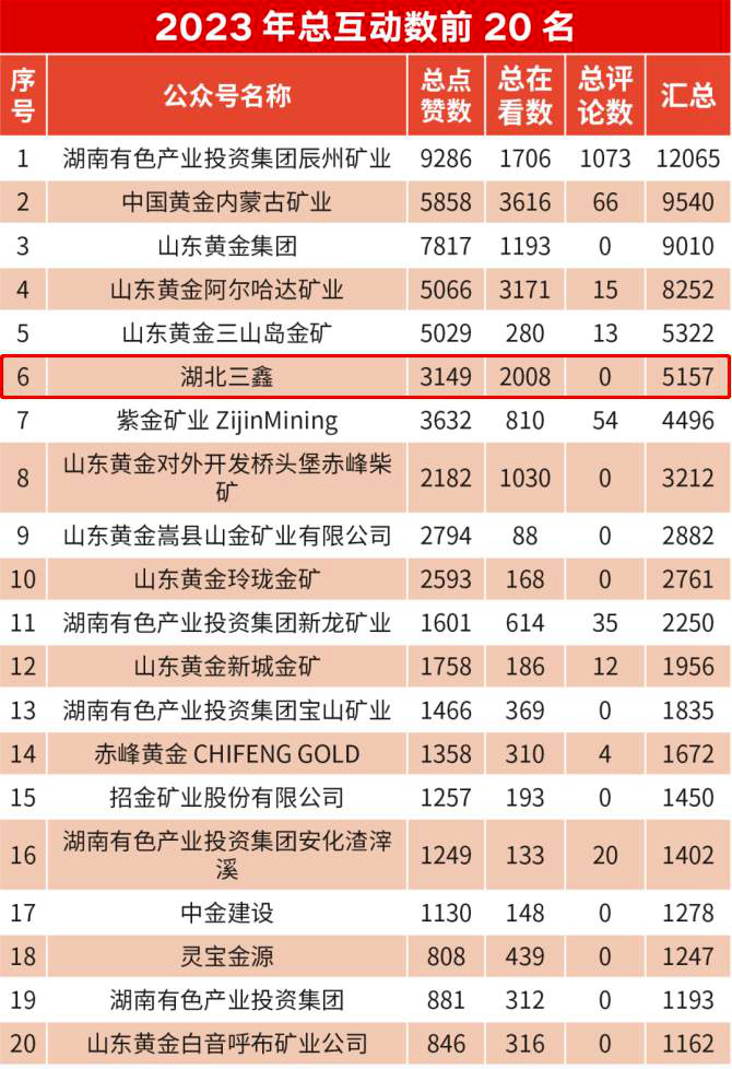 近日,中国黄金报公布了中国黄金矿业2023年新媒体20强榜单,对70多家具有影响力的黄金矿山企业的新媒体公众号传播效果进行了排名,从总阅读量、文章总数、发布天数、总互动数、各公号单篇文章阅读量5个维度进行排序。bv1946伟德公众号总阅读量为10.03万,排名十九;总互动数5157,排名第六。