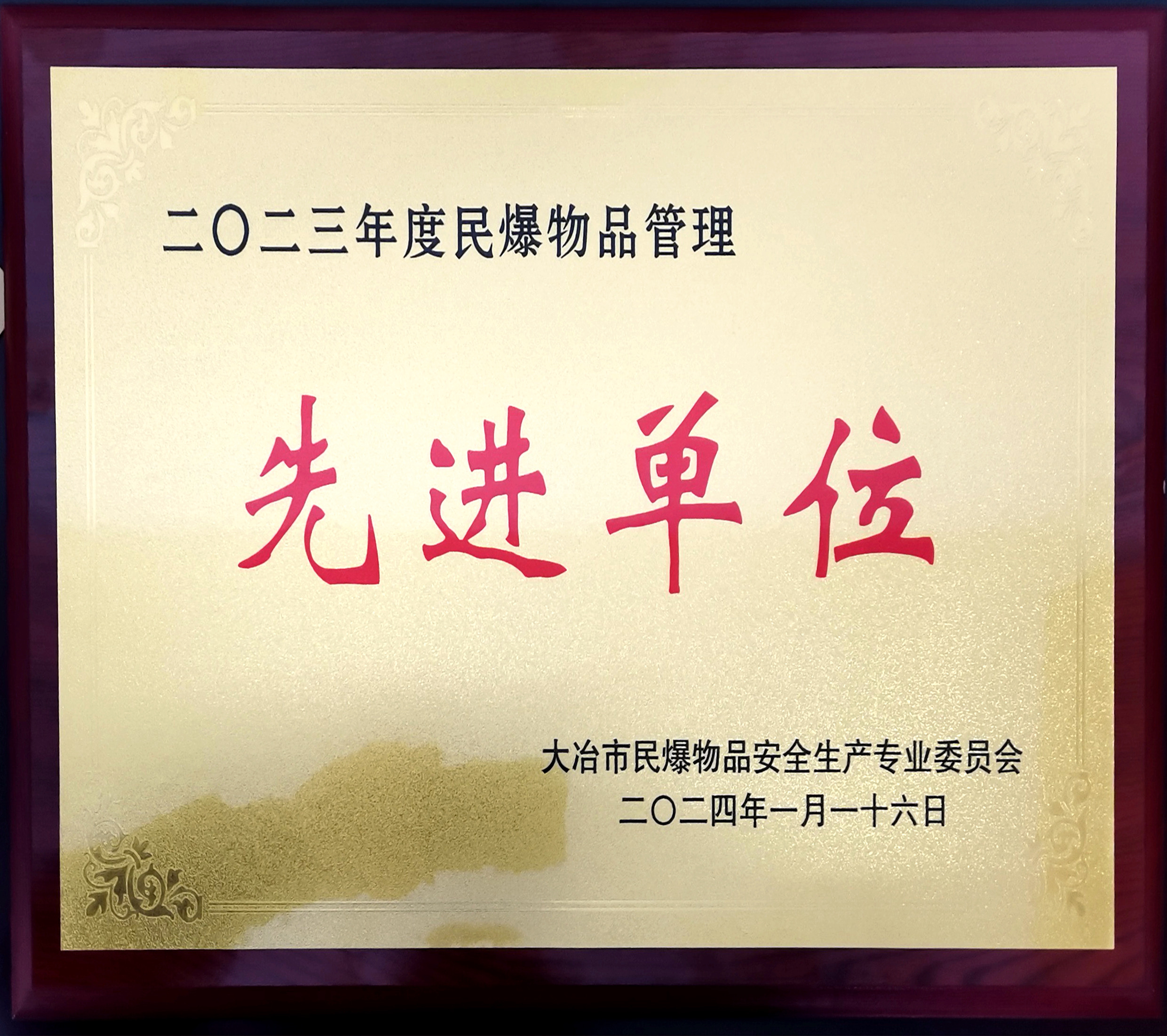 1月24日,在大冶市召开的民爆物品管理工作表彰大会上,bv1946伟德被授予“2023年度民爆物品管理先进单位”。武装保卫部部长柯元胜荣获“2023年度民爆物品先进个人”称号,并代表公司在会上作经验交流。