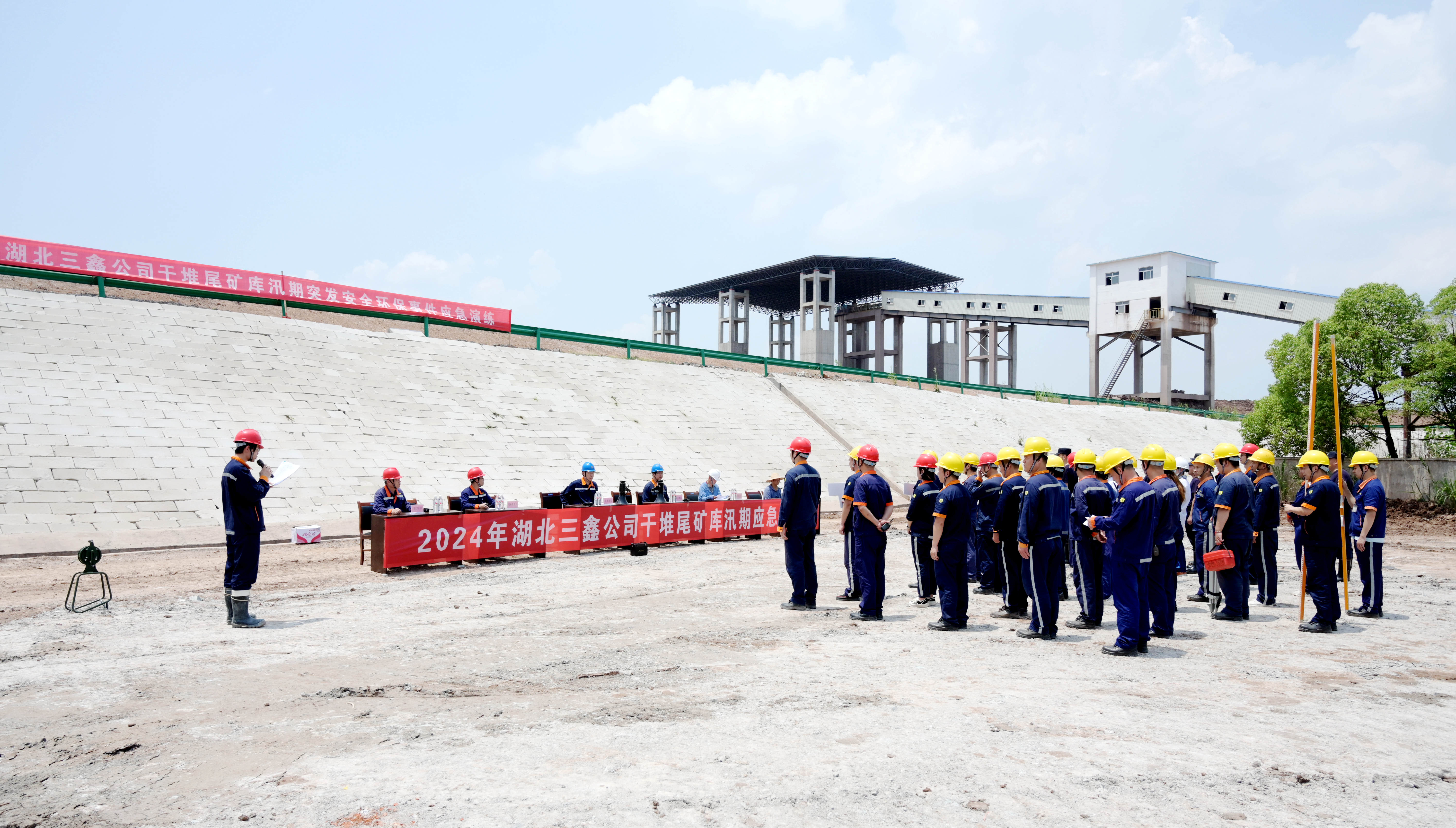 为推进安全生产治本攻坚三年行动深入开展,切实提高干堆尾矿库汛期突发安全环保事件应急响应能力、应急救援能力、与地方部门应急联动处置能力,5月24日,bv1946伟德开展2024年干堆尾矿库汛期突发安全环保事件应急演练。公司党委书记、董事长、应急救援指挥部总指挥长王宪忠出席演练并讲话,党委委员、副总经理、应急救援指挥部副总指挥长郑杰以及大冶市环保局、株林村等单位部门有关人员参加活动。