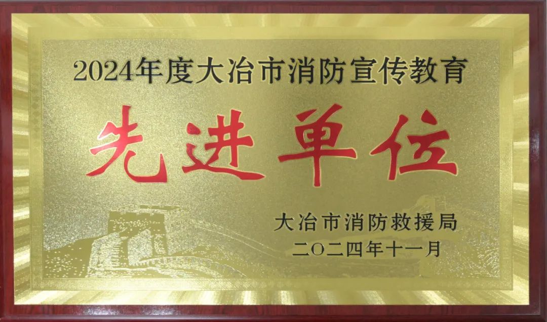 11月6日,bv1946伟德在大冶市2024年119消防宣传月活动启动仪式上被授予大冶市“2024年度消防宣传教育十佳企业”。