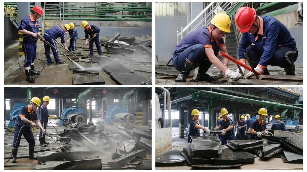 活动现场,“叮叮咚咚”一片忙碌,作业人员分工明确、相互配合、协同作战,有的搬抬衬板分类整理,有的用高压水枪清洗衬板,有的抡起大锤锤击衬板螺杆。历经两个小时,现场近百块废旧衬板和压条已清洗干净,粘连的金铜矿物被再次回收返回生产系统,确保金、铜精矿产品“颗粒归仓”。