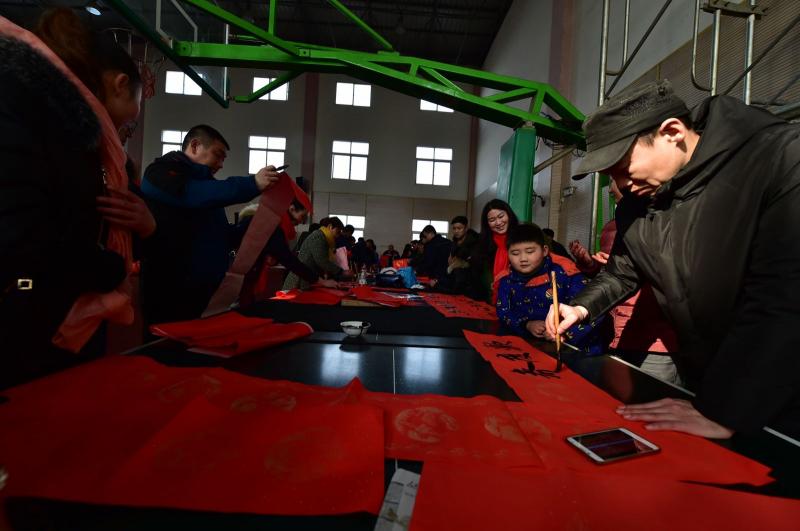 市书法家协会会员现场挥毫为员工书写春联