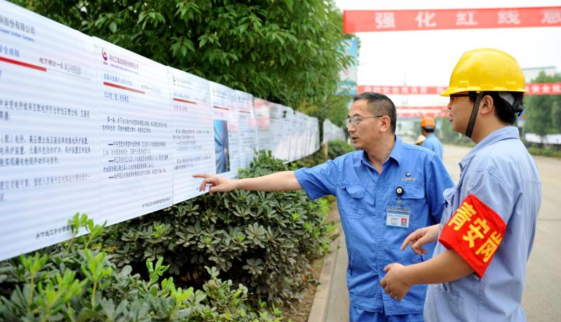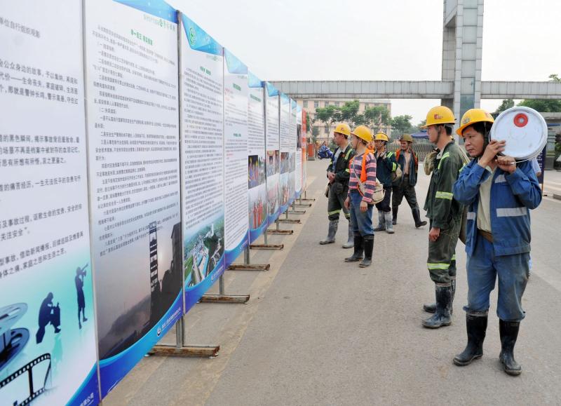 公司员工和外委施工单位作业人员在观看安全展板。