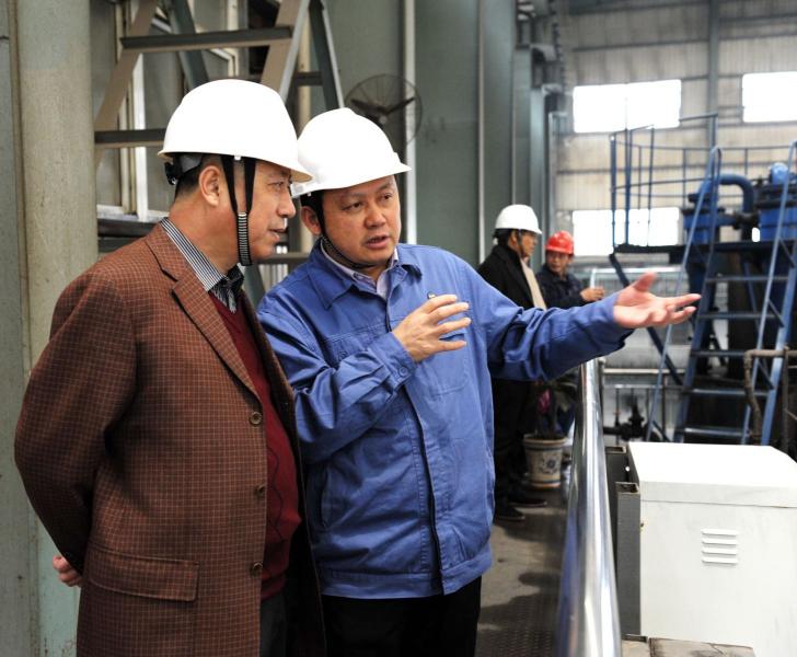 图为集团公司副总经理孙连忠(左一)在公司磨浮工段调研。