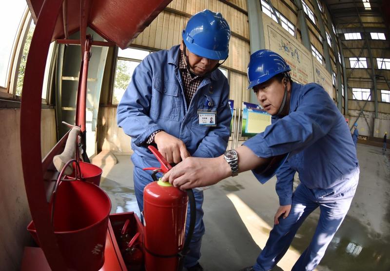公司领导孙超(右一)、毛怀春(左一)检查选矿车间消防设施设备