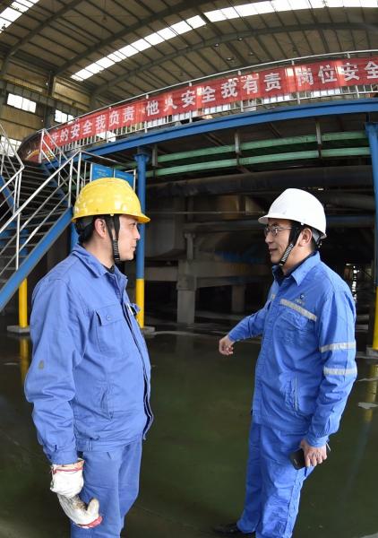 公司领导王友元(右一)与选矿车间员工进行精细化管理交流
