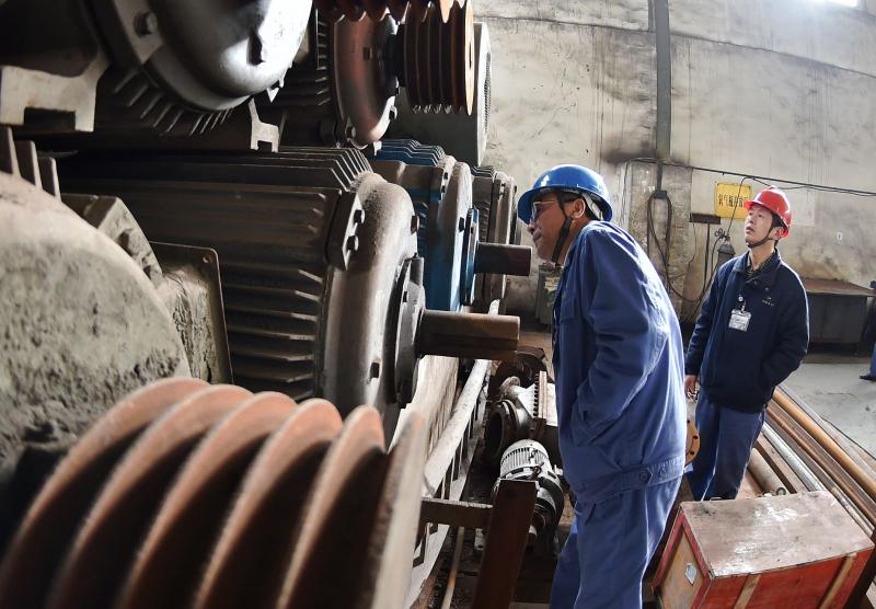 公司领导杨培炎(左一)检查选矿车间磨浮工段备用电机的情况