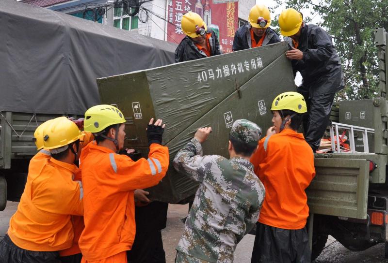 “来,大家一起使劲,一、二、三——”武保部部长柯元胜大声喊着口号,一艘艘冲锋舟、橡皮艇陆续地从车上抬下来。