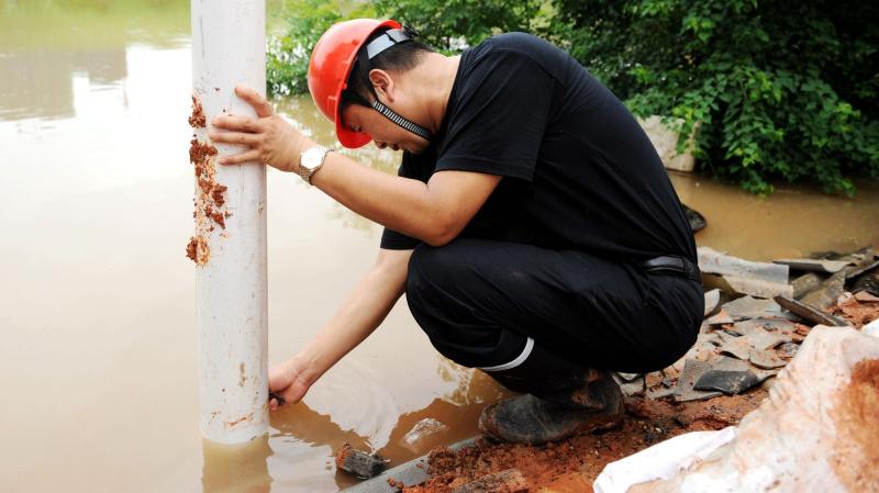 柯元胜做水位记号,提醒救援队员争分夺秒。