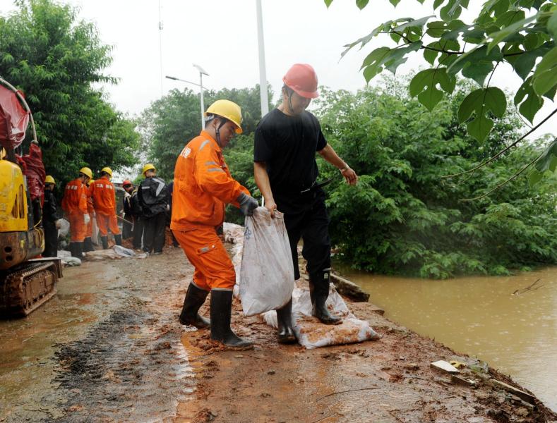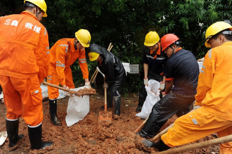 救援队员冒雨筑堤。
