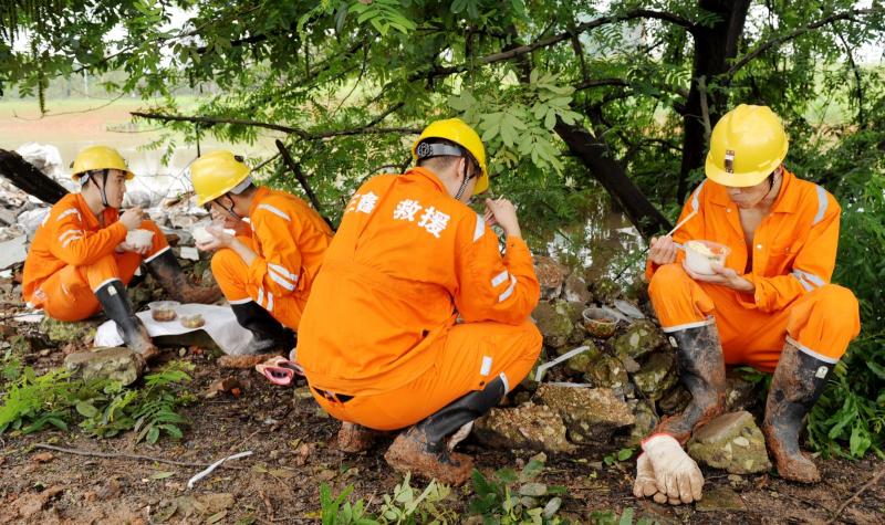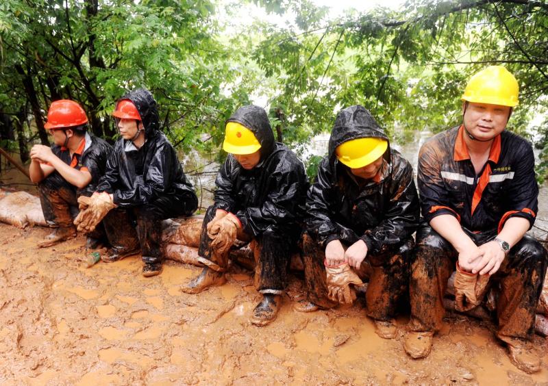 装黄泥的货车进不来,救援队员休息一会儿。