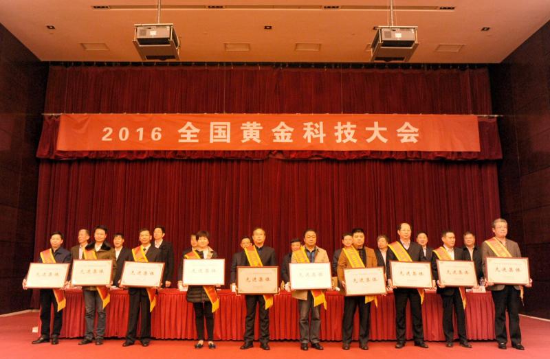 公司副总经理郑杰(前排右三)在领取2016年全国黄金行业科技先进集体奖牌。