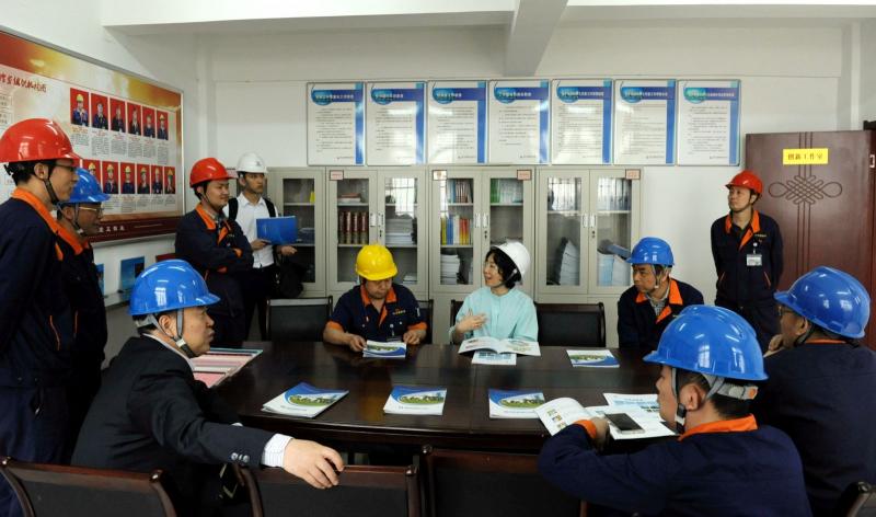 高世贤(右一)向王晓梅(右二)介绍公司回水处理厂运作流程。