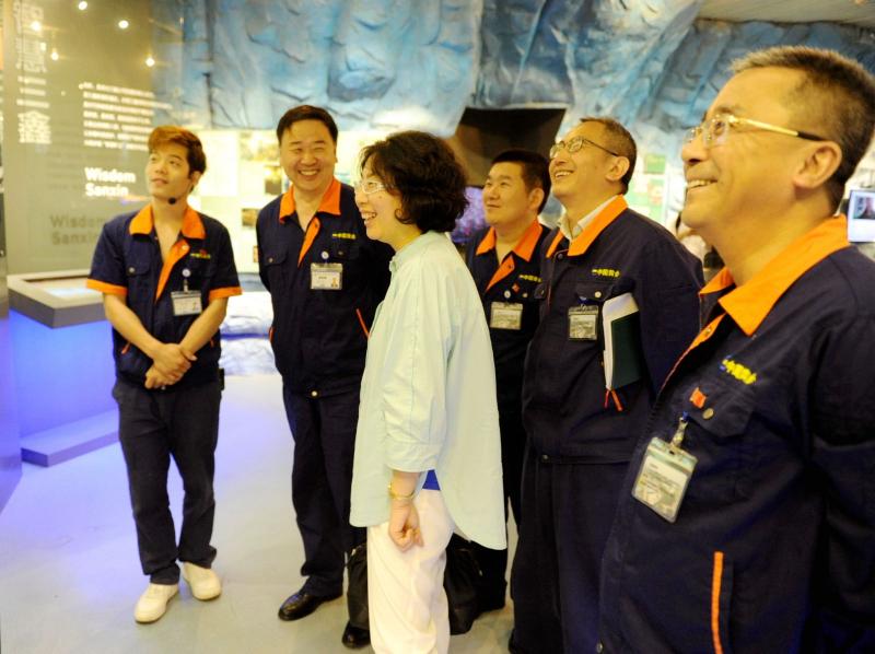 王晓梅在调研公司展览室时对公司发展的变化给予肯定和赞赏。